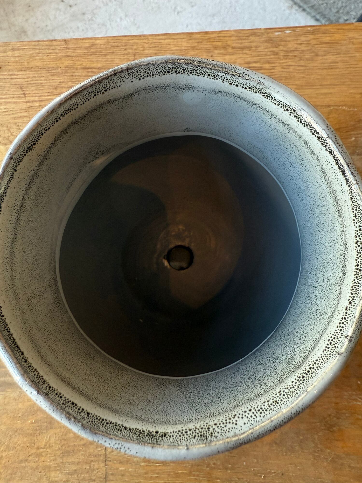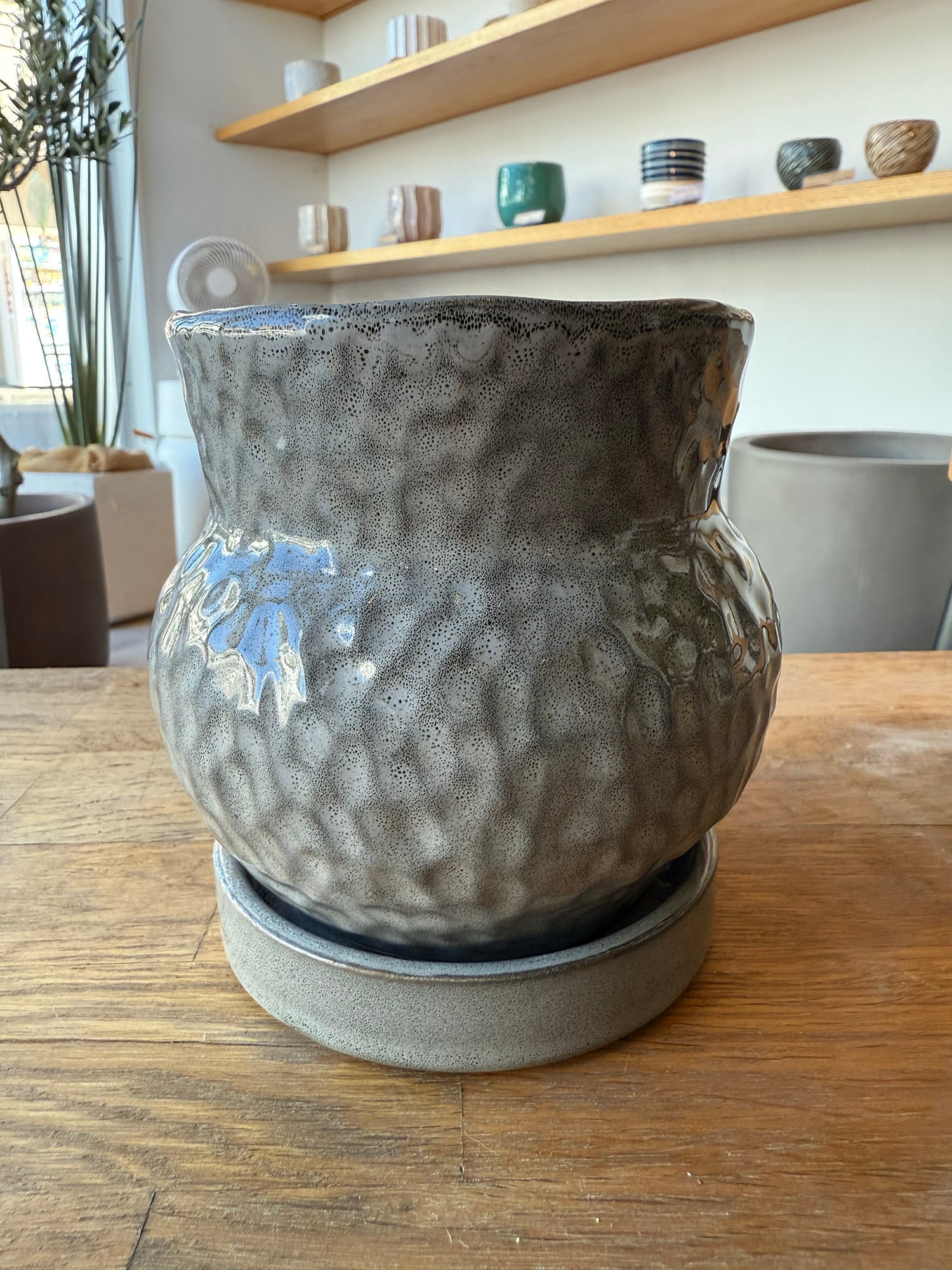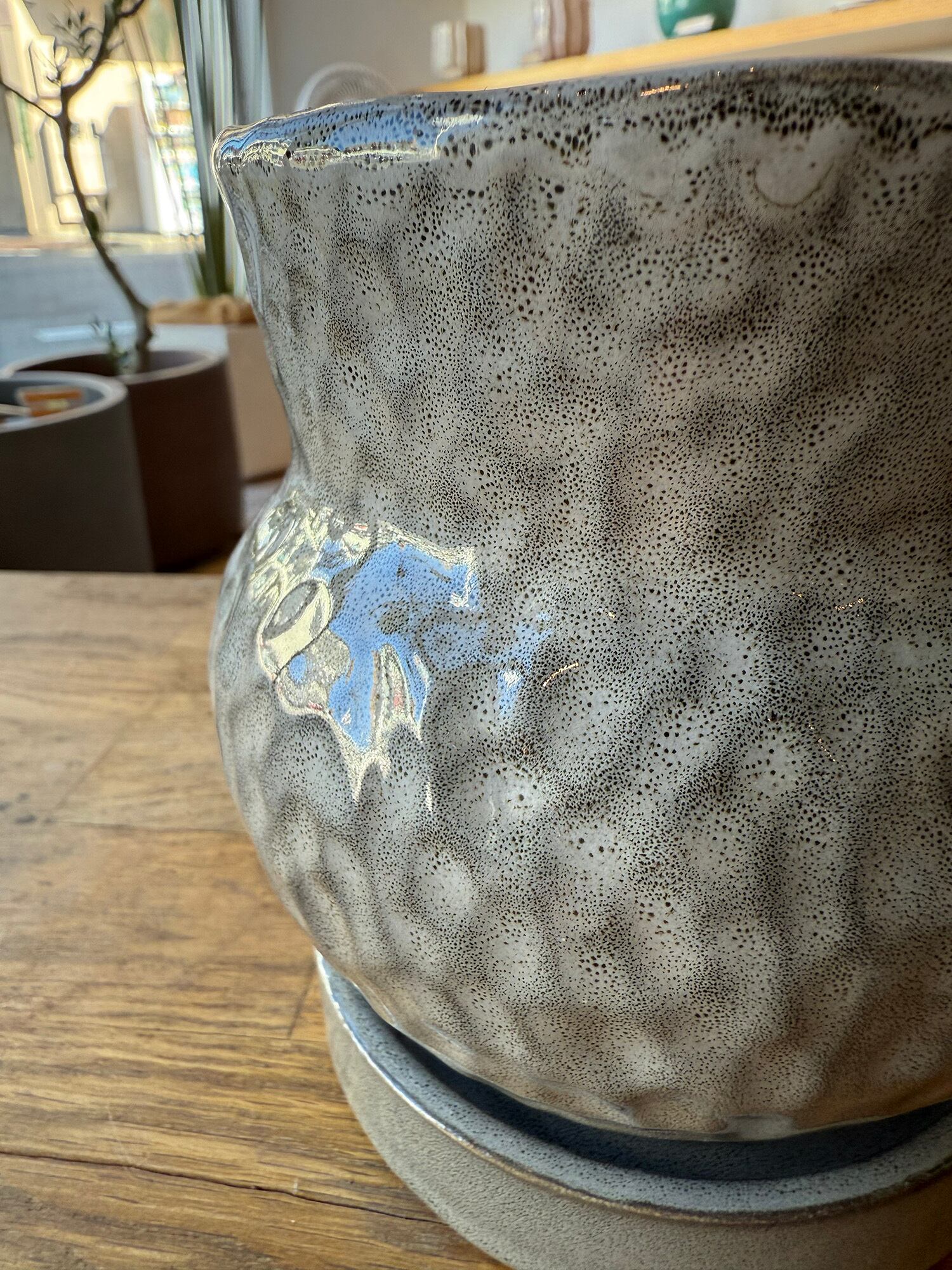 壺のような形をした陶器鉢。表面上の凹凸が良い味を出しているので、艶のあるグレーが綺麗に映えます。樹形がユニークな木や蔓性の植物を植えるのにおススメの陶器鉢です。