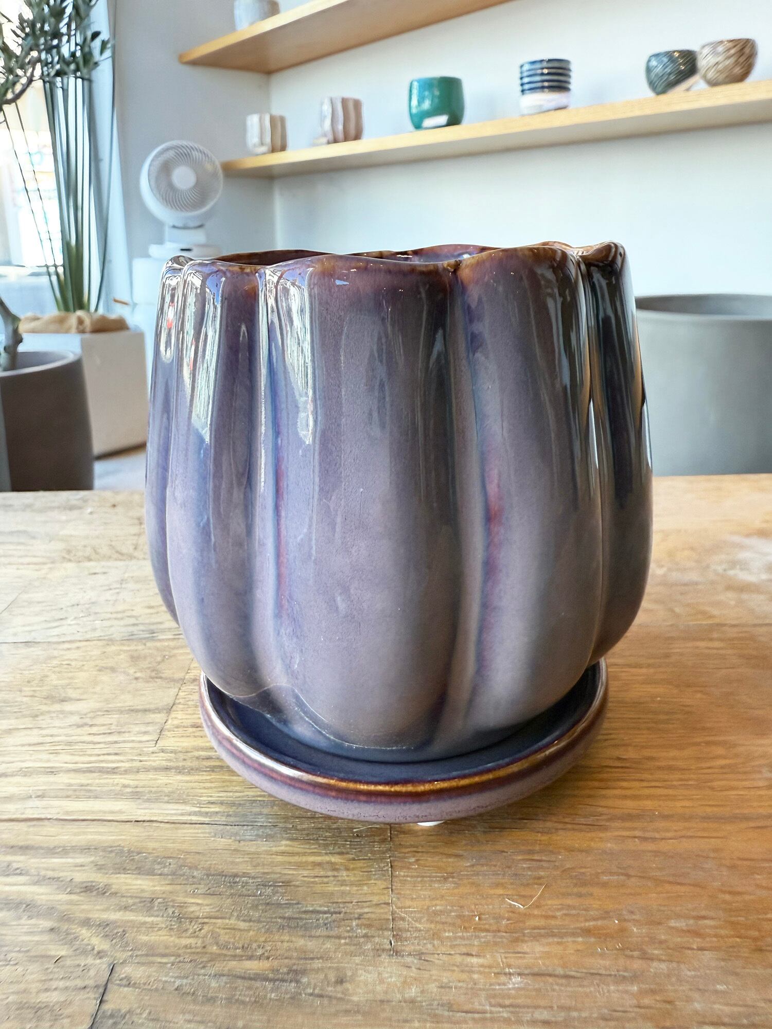 チューリップのような造形が柔らかな印象の陶器鉢。艶やかなパープルカラーは目を引くので、鉢だけを置くだけでもインテリアとしても楽しめる一鉢です。