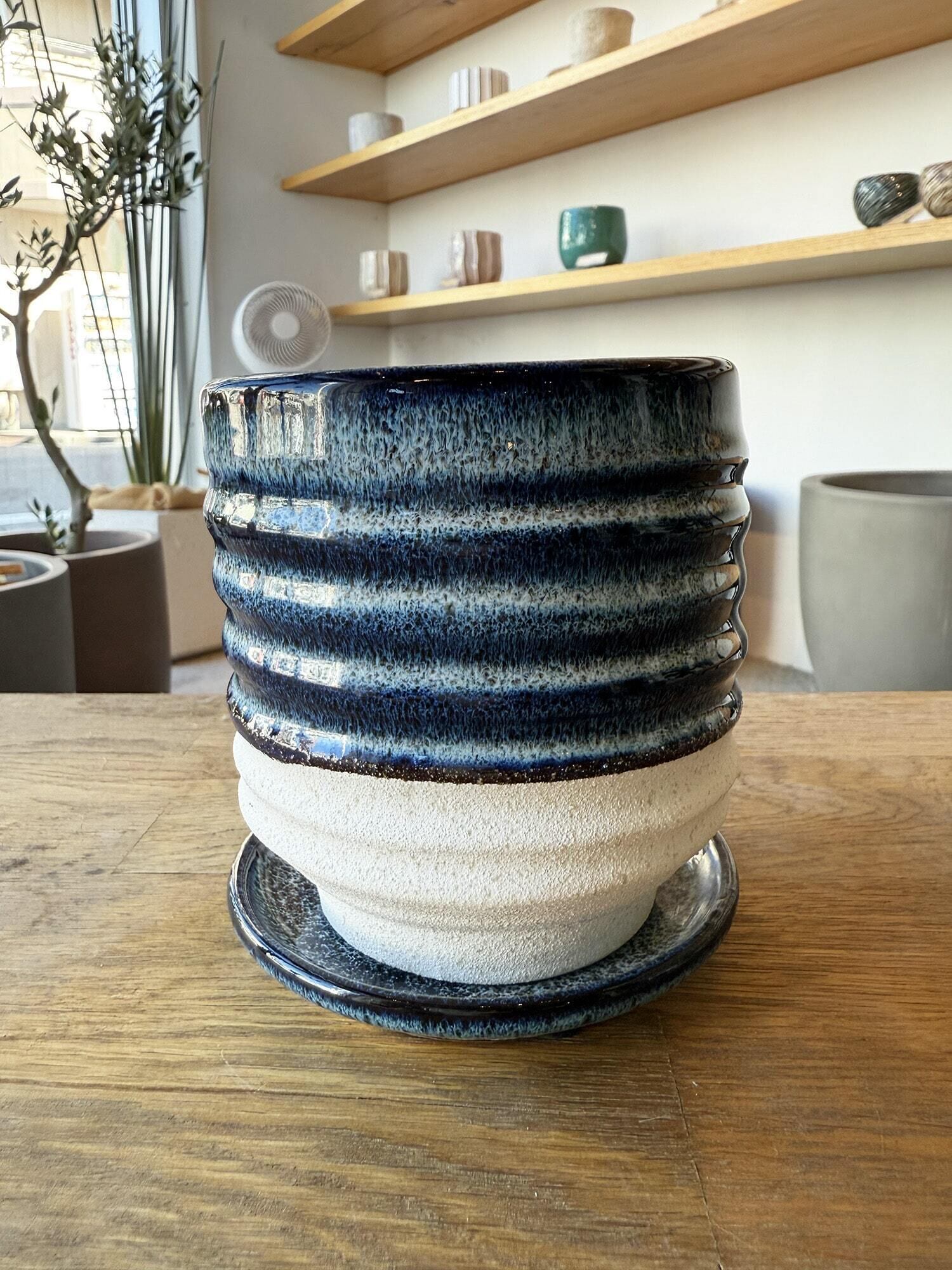 鮮やかなブルーとクリーム色のツートンが可愛く、目を引く一鉢です。少し高さのある鉢なので樹形がユニークな木タイプを入れるのも良さそうです。