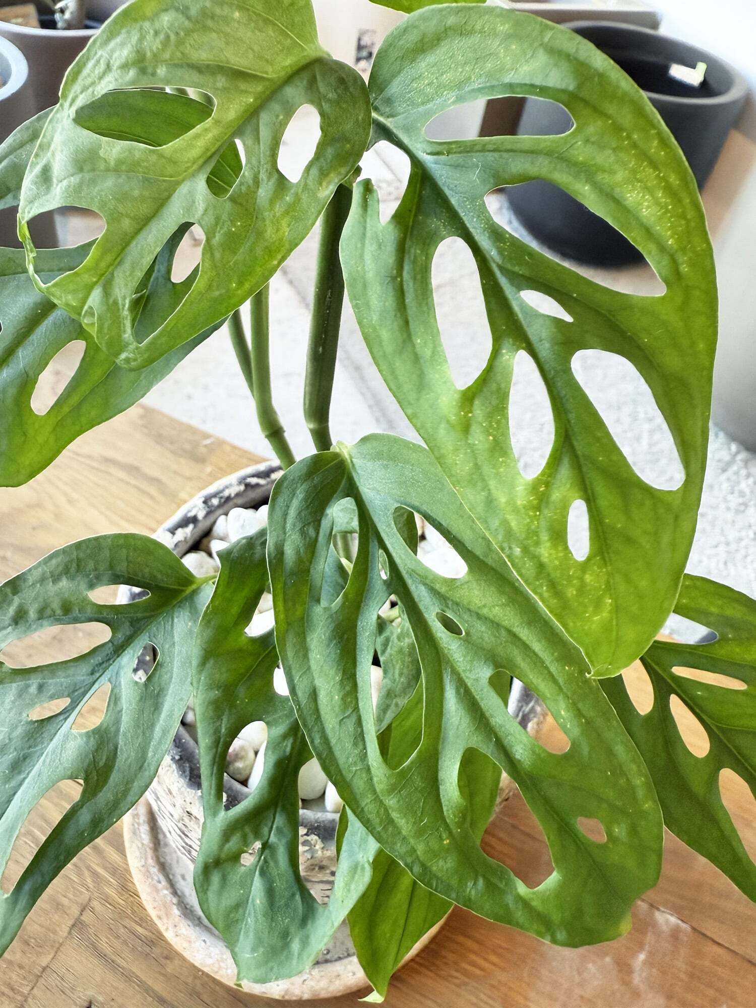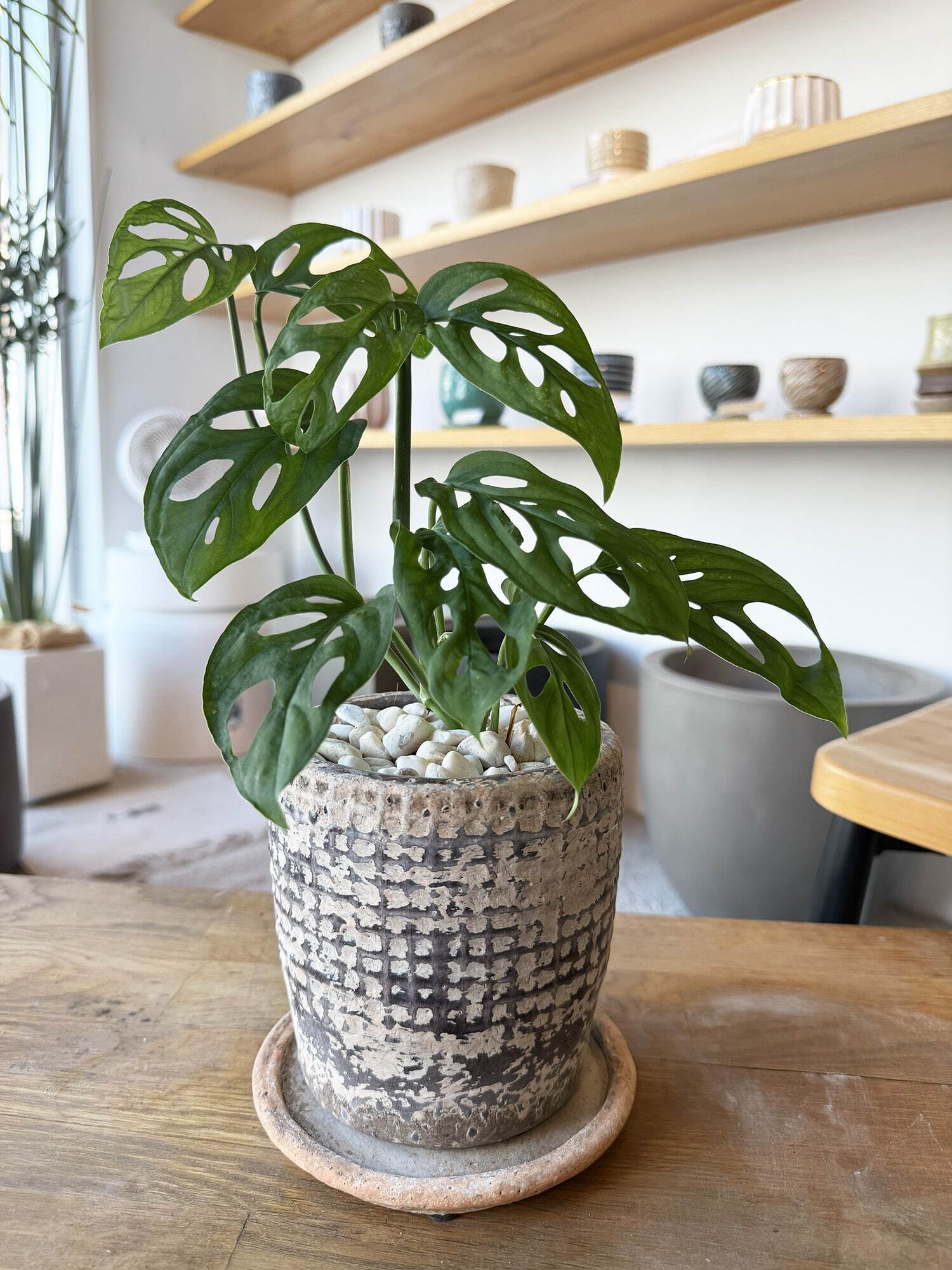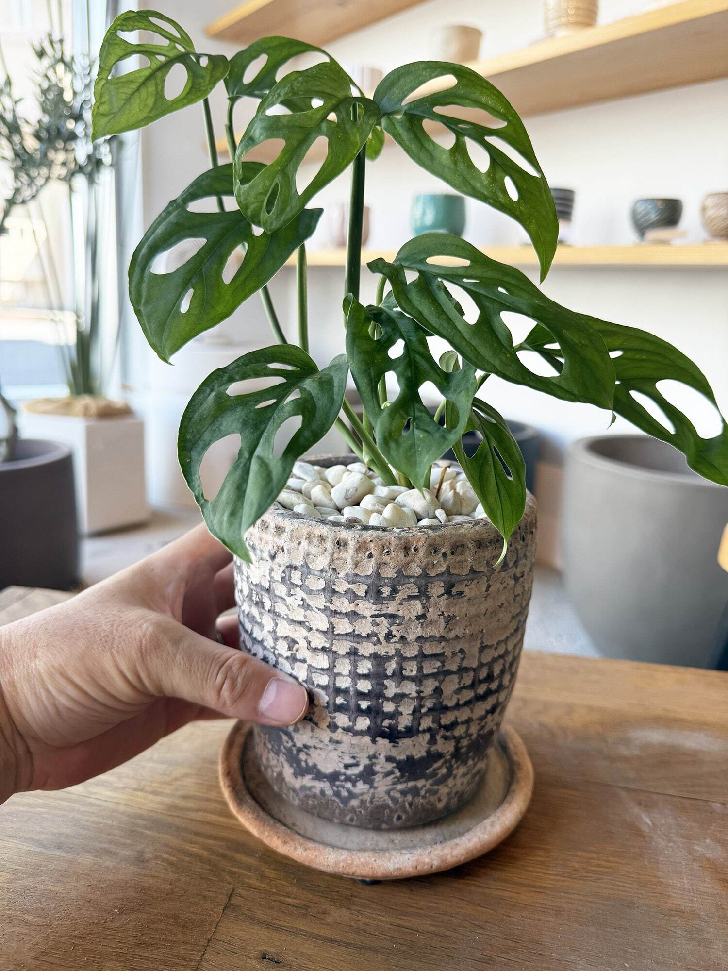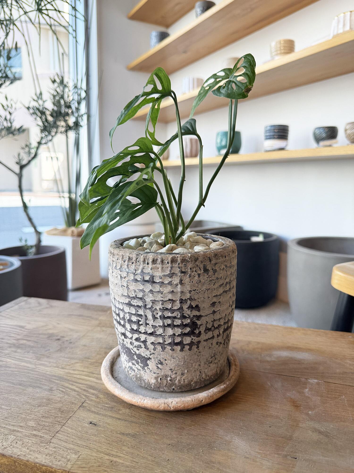 葉の中心部分に穴が開く不思議な姿が特徴的。蔓性植物なので、蔓が伸びてくるとより個性的なインテリアグリーンとして楽しめ、棚の上やハンギングにして垂らしてみるのも良いですね。