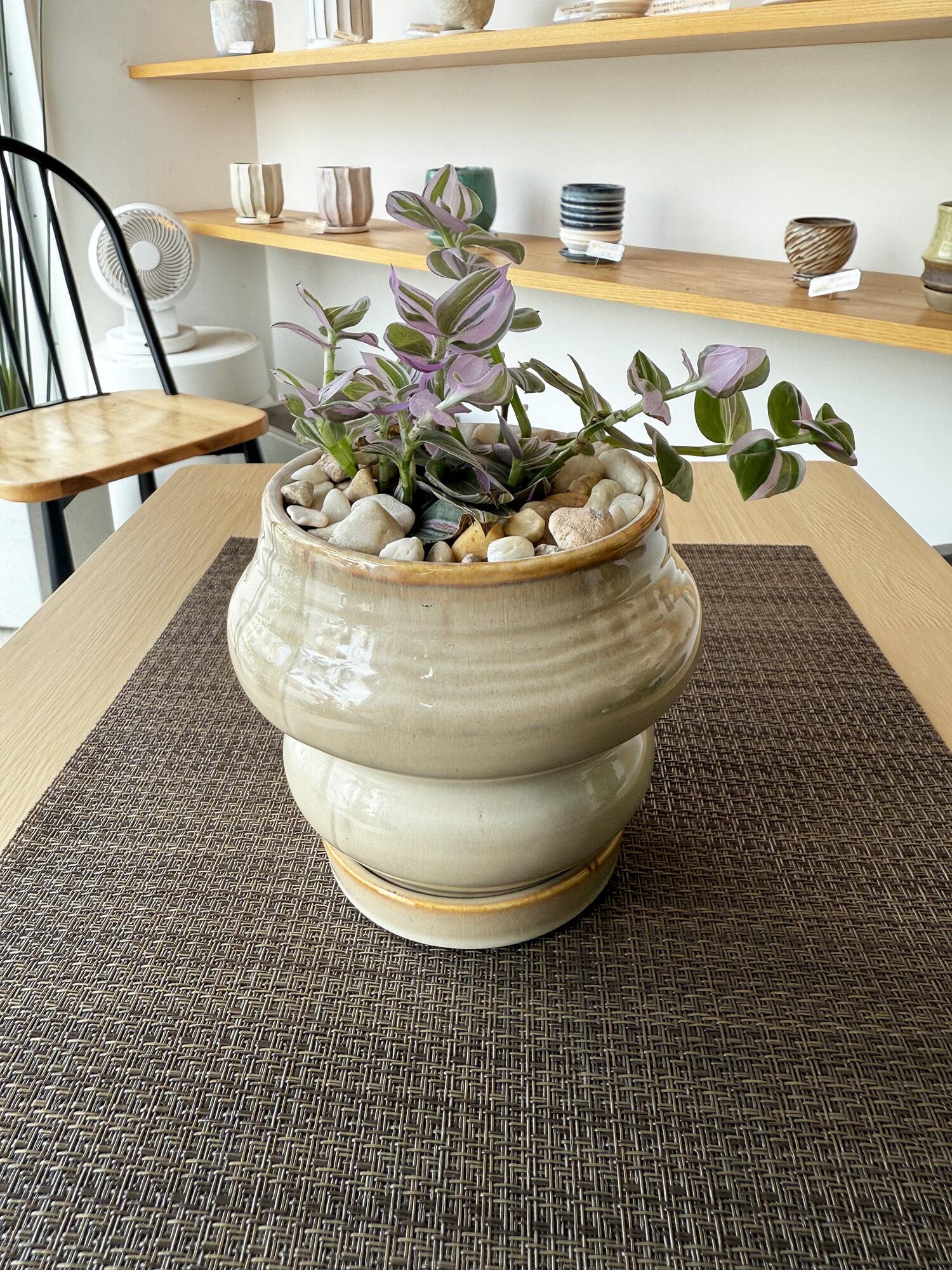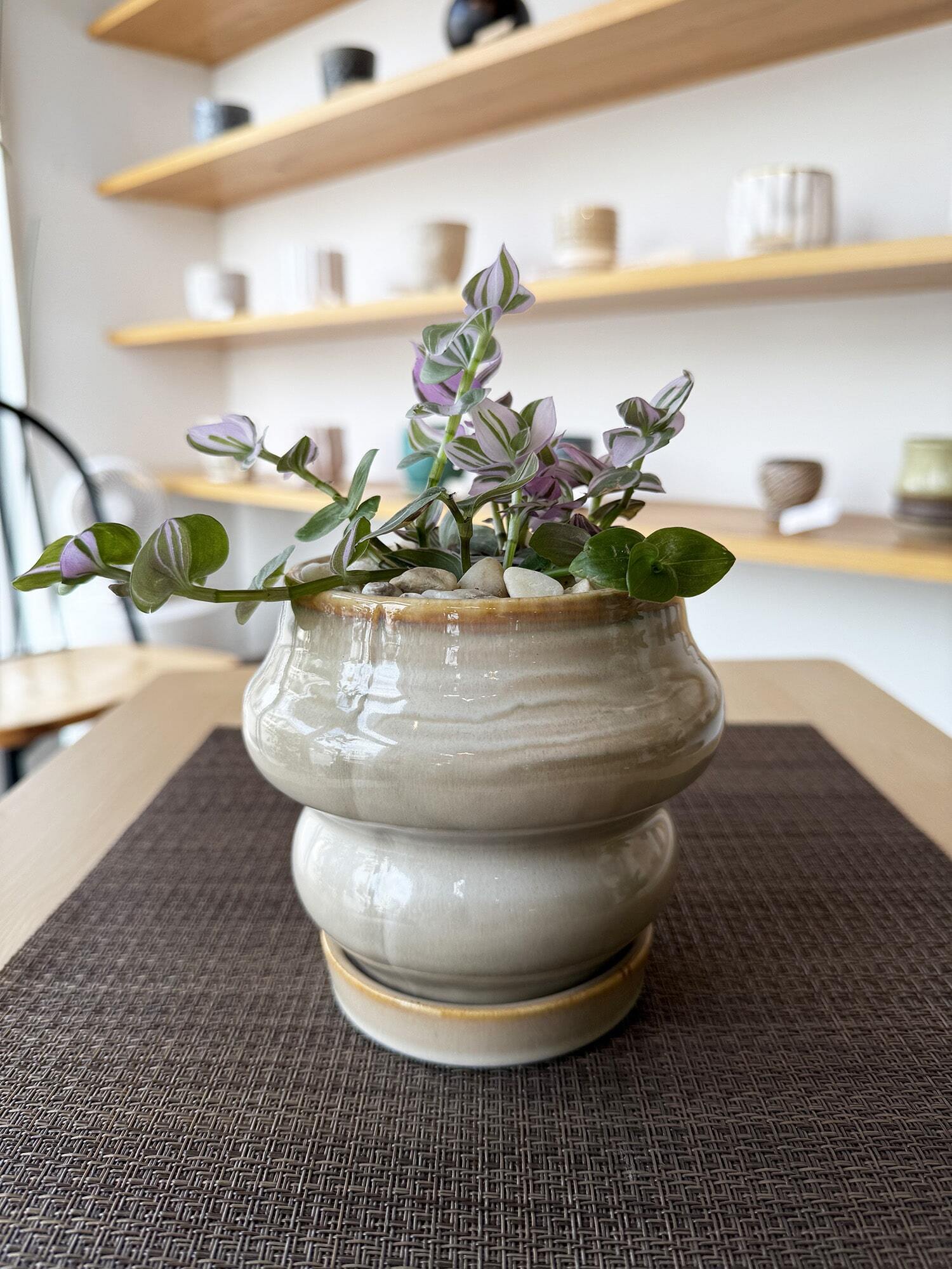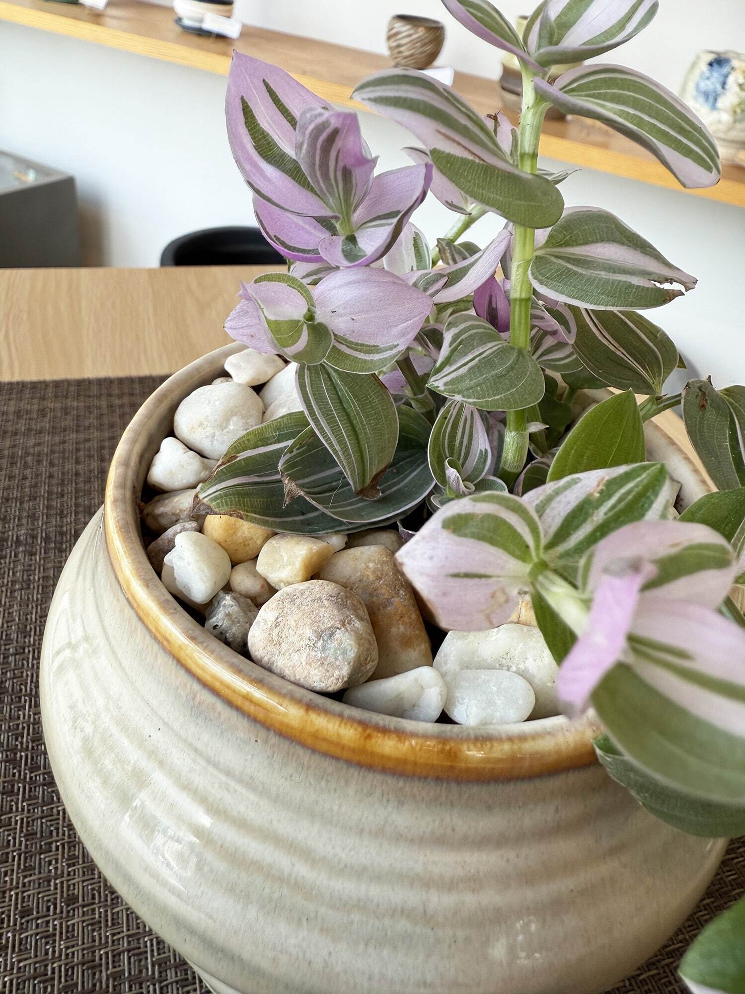 凹凸のあるデザインの陶器鉢がインテリアにも映え、ベージュカラーと葉色のラベンダー色の組み合わせも鮮やかです。