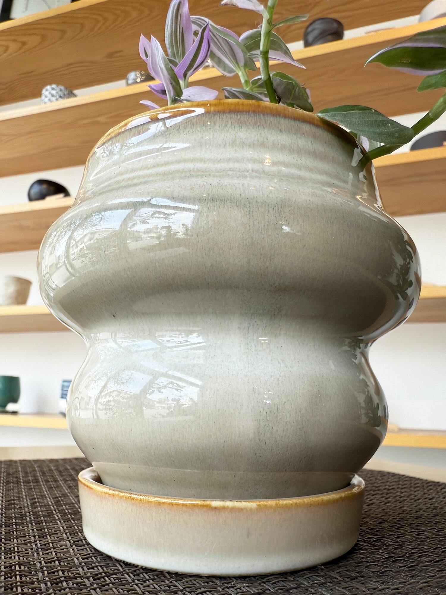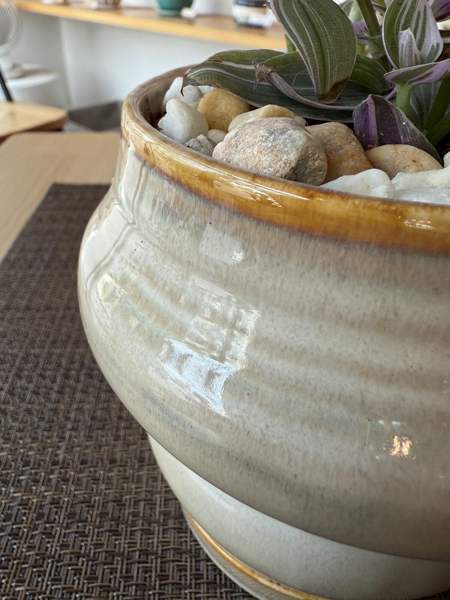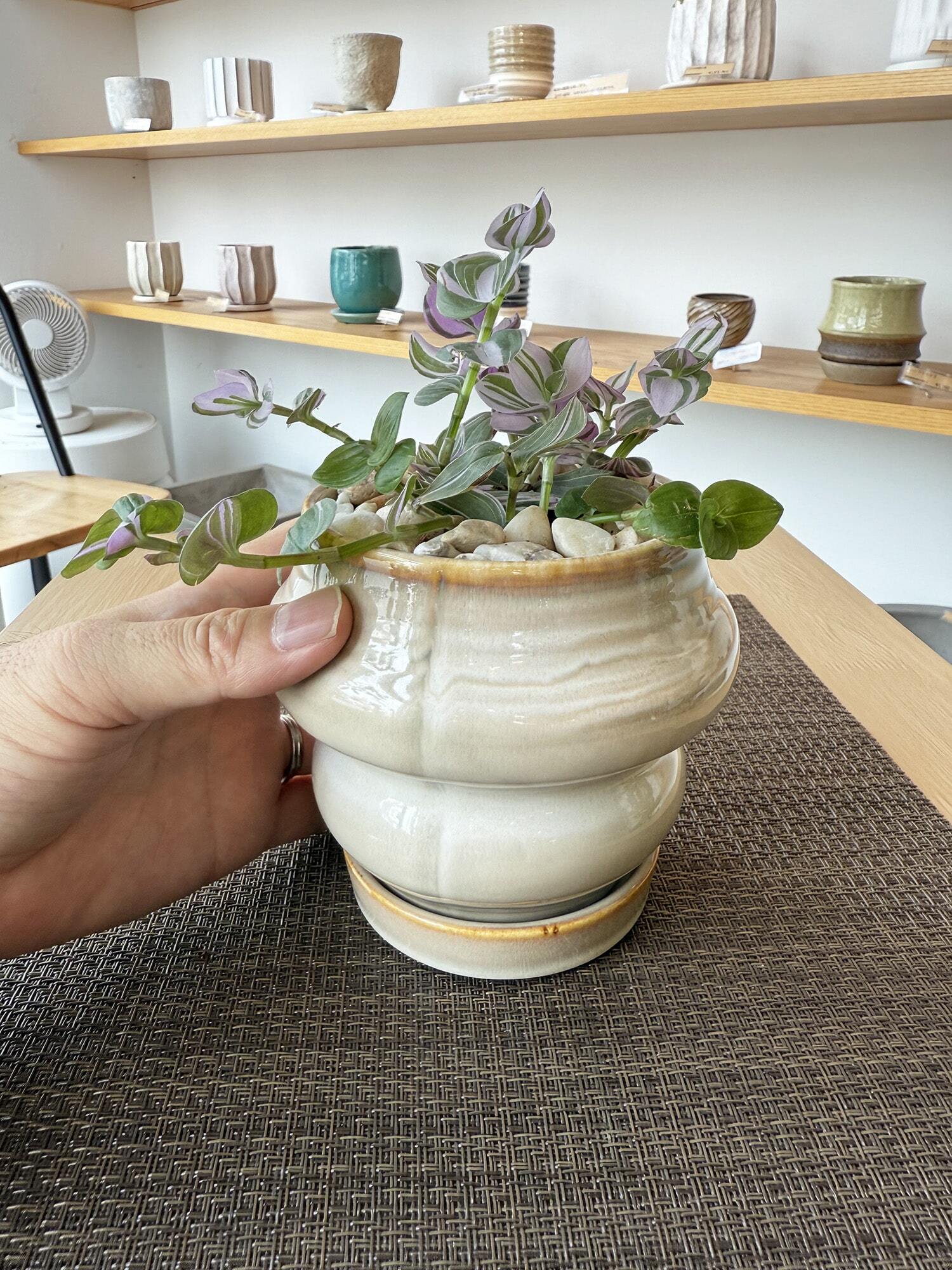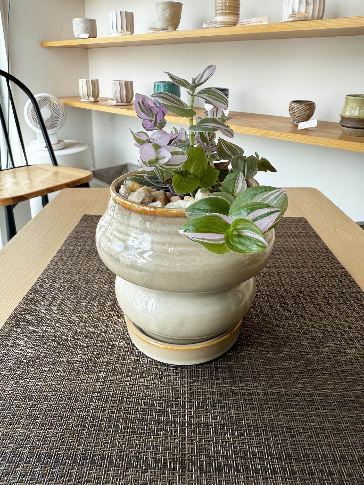 凹凸のあるデザインの陶器鉢がインテリアにも映え、ベージュカラーと葉色のラベンダー色の組み合わせも鮮やかです。