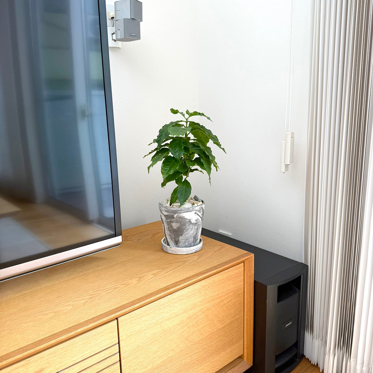 ツヤツヤの葉っぱは、年中お部屋にグリーンを感じさせてくれます。育てていくと、もしかすると真っ赤なコーヒーの実を実らせてくれるかも。