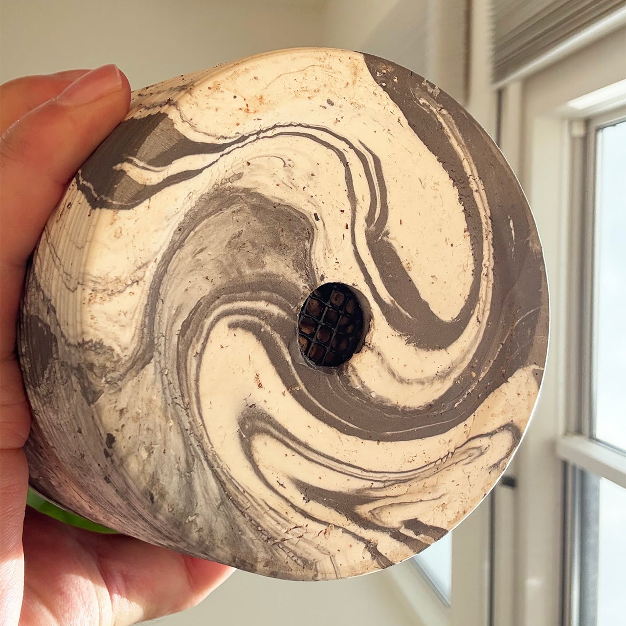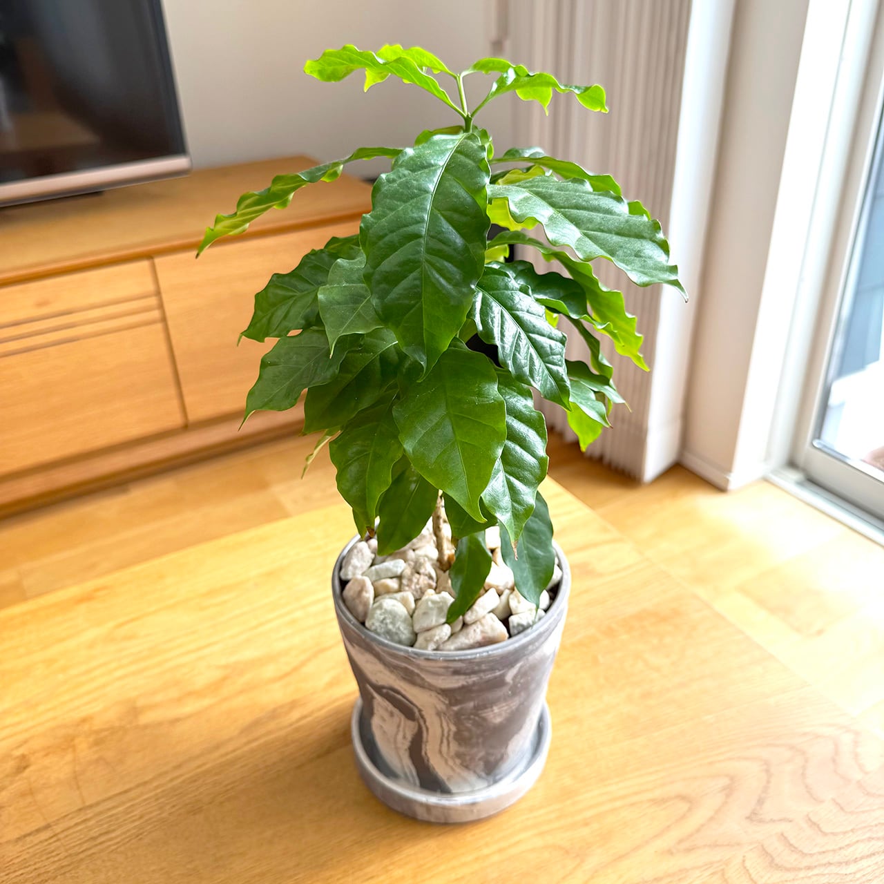 マーブル模様の陶器鉢が特徴的で、濃いめのグリーンの葉のコーヒーにデザイン性を与えてくれるので、インテリアとしても楽しめる一鉢となります。