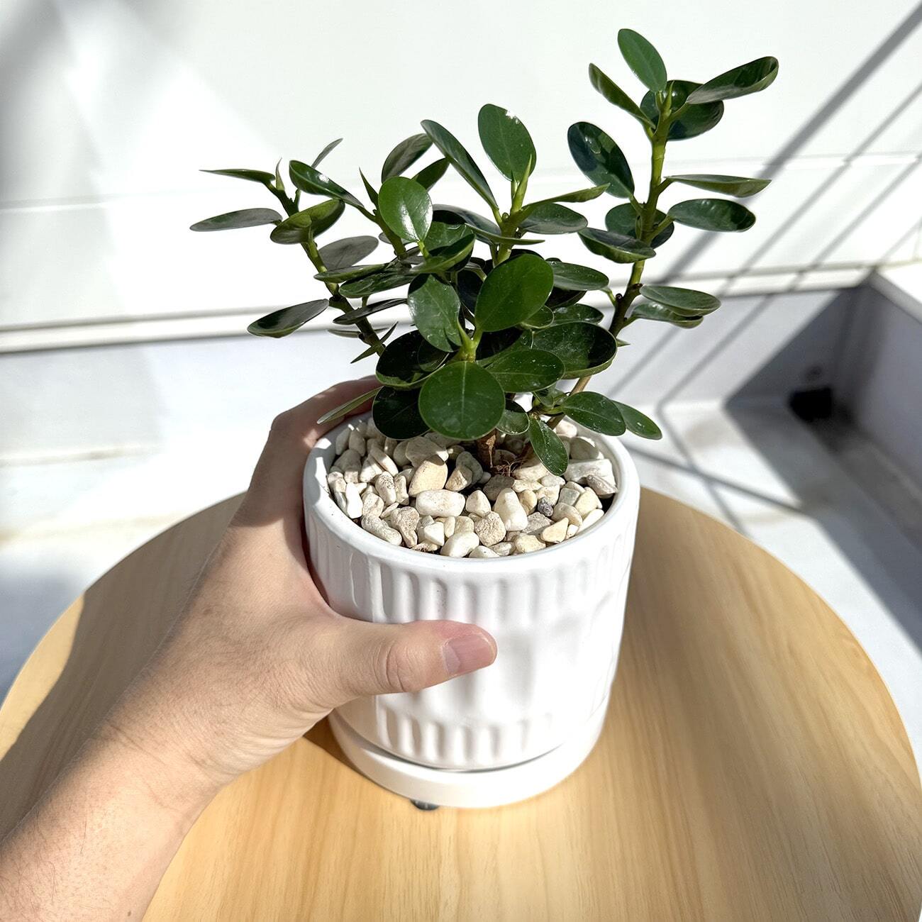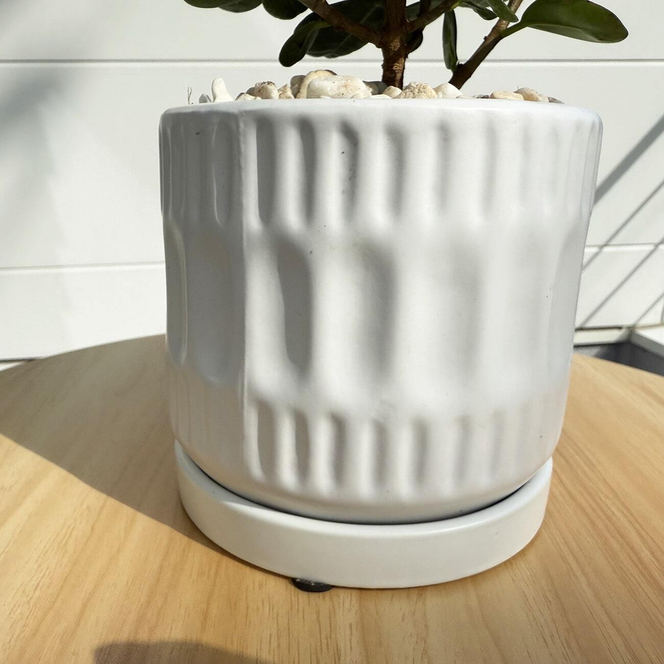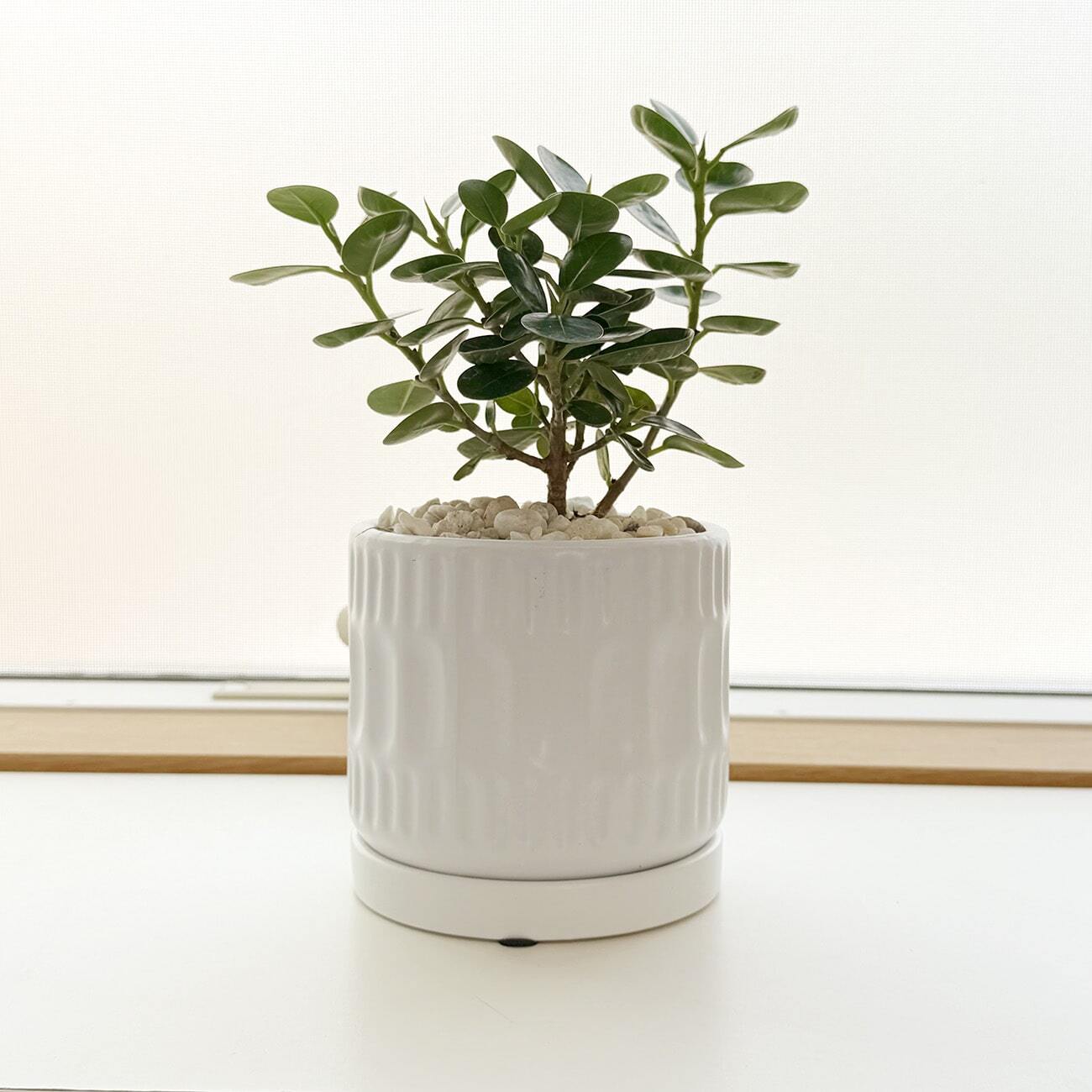 シンプルなマットは白い陶器鉢は、あらゆるシーンに合わせやすく、葉の可愛さも引き立ててくれる組み合わせです。