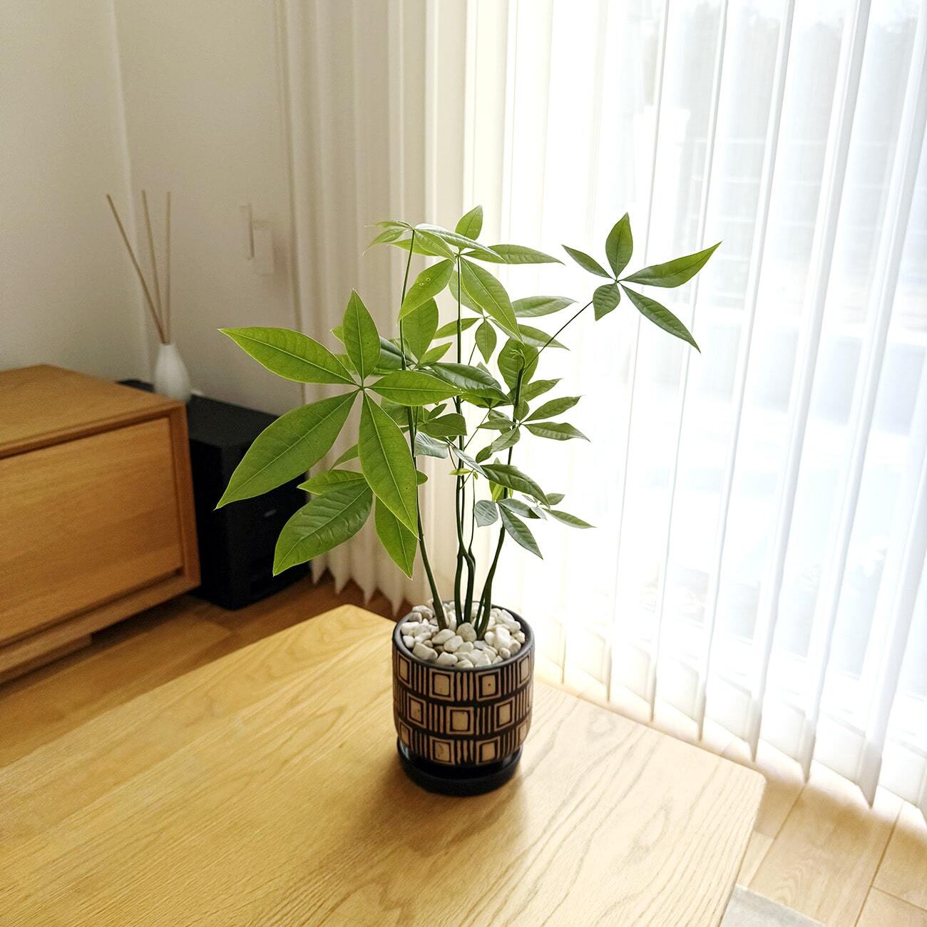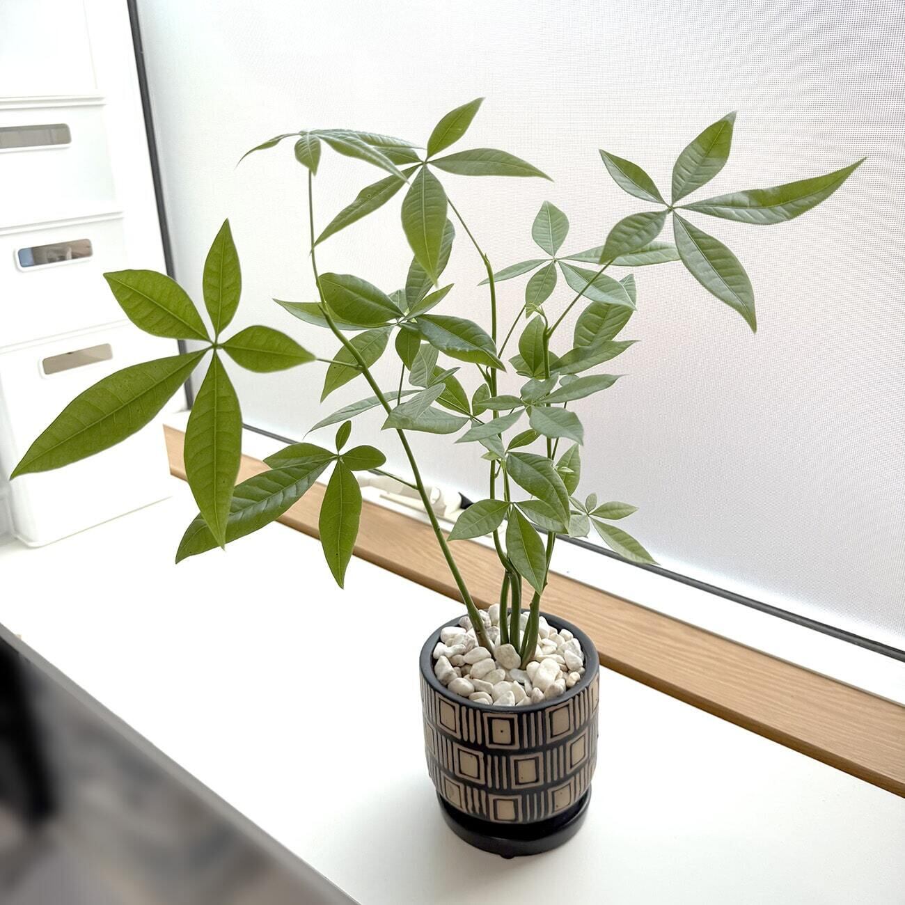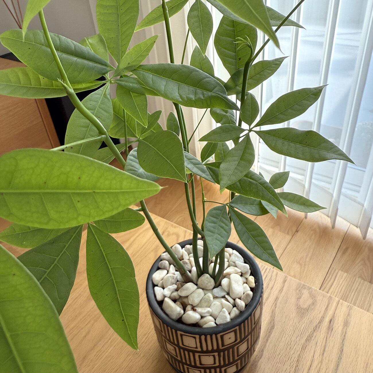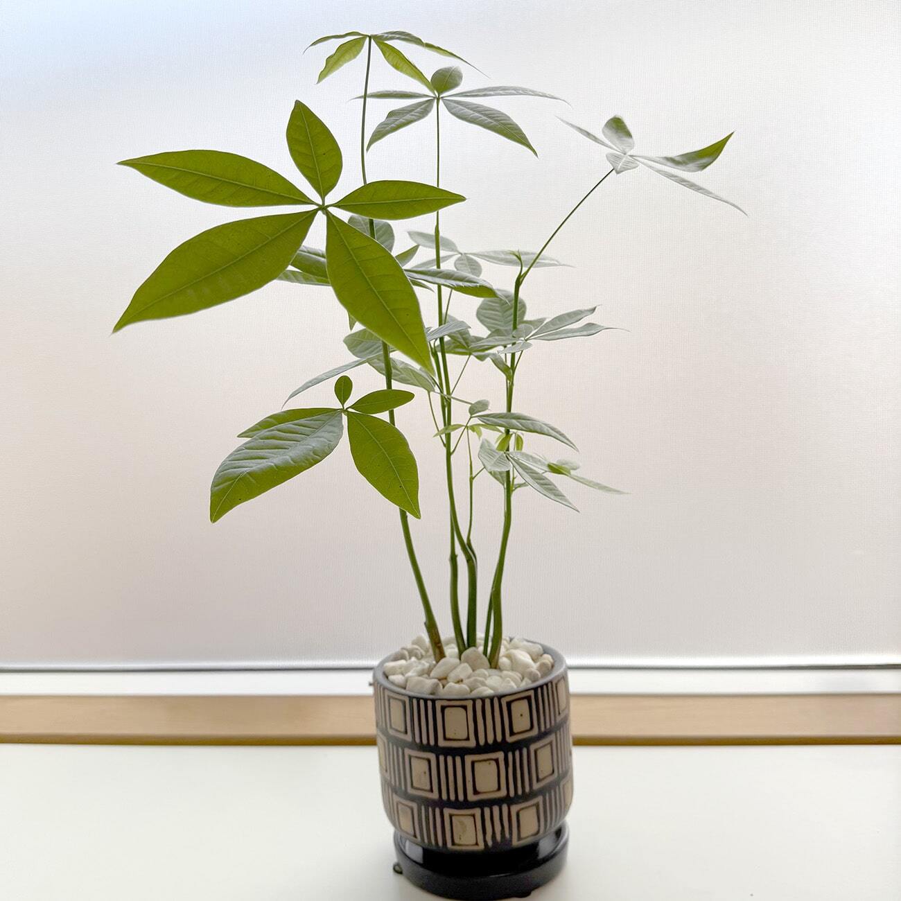 種から発芽させて状態(実生)のパキラは、幹が細い分ちょっと曲がったり、自由に伸びている姿が特徴的。もちろん育てやすさは実生も挿し木も変わらず育てやすい種類です。