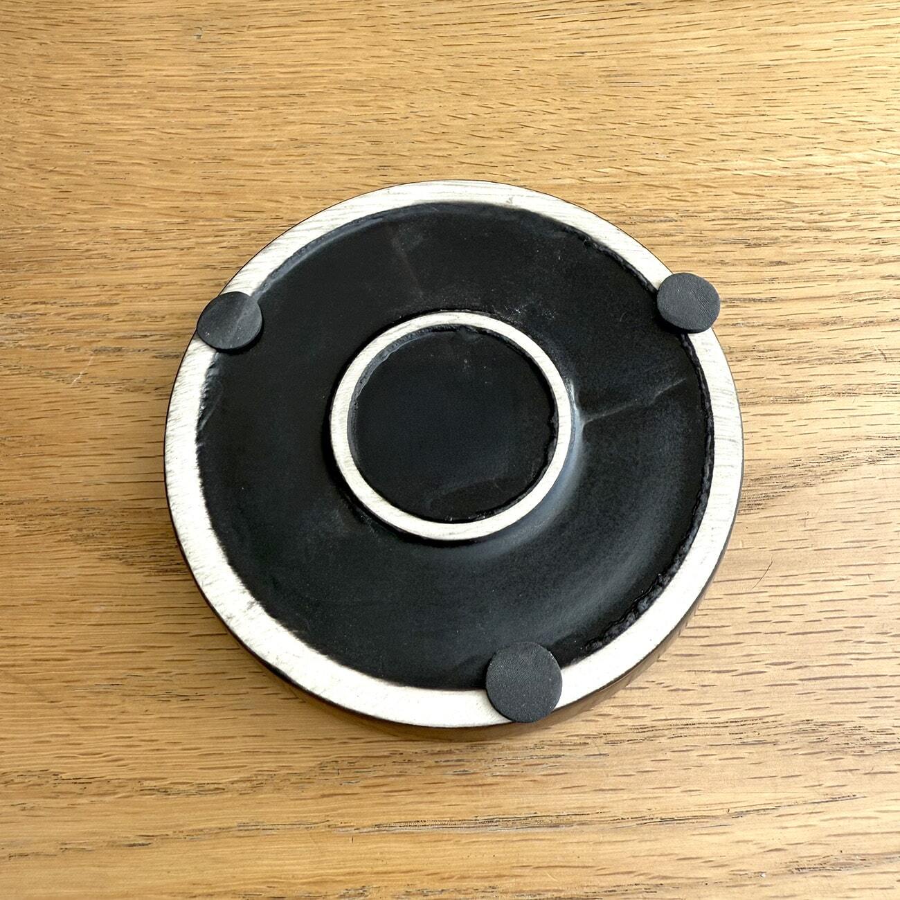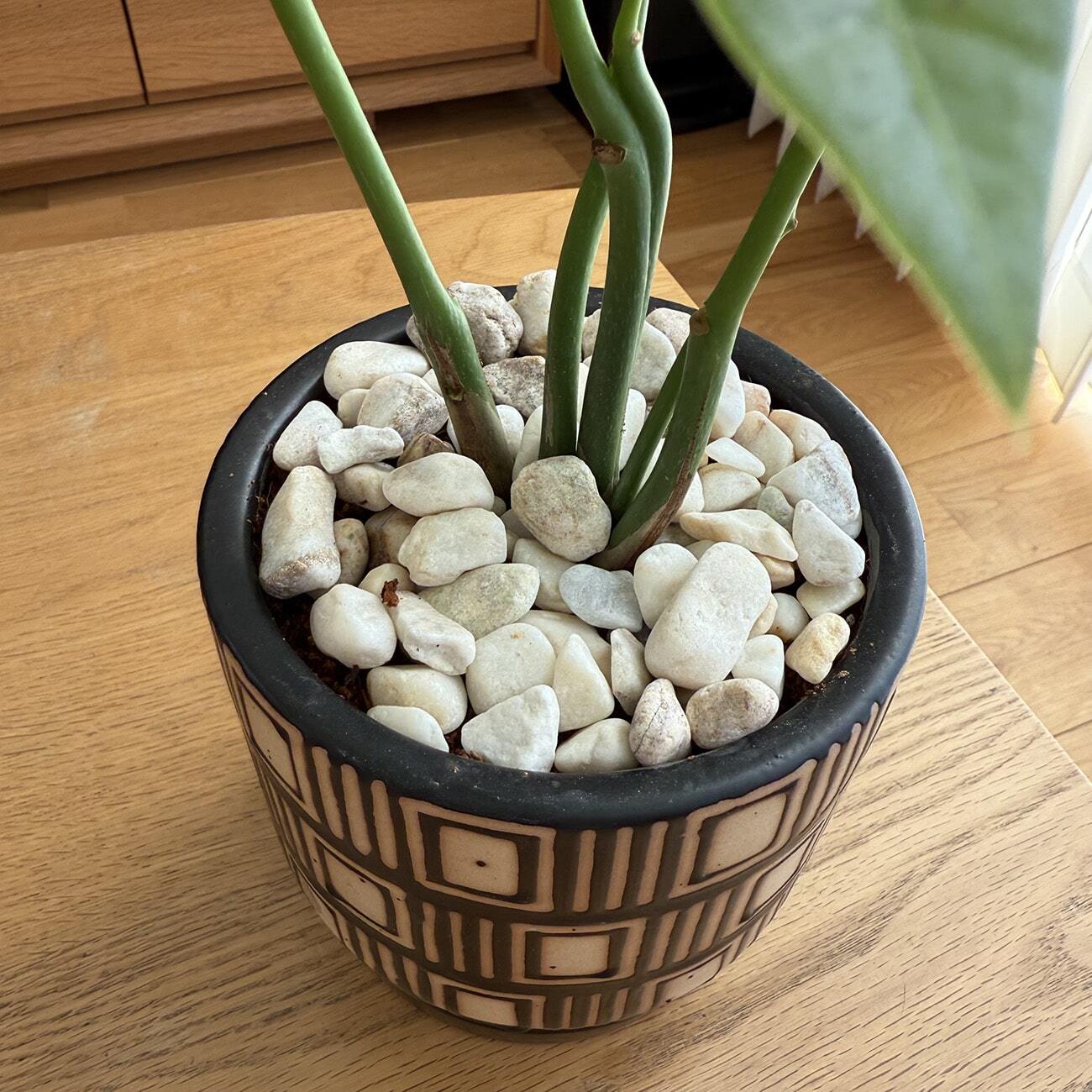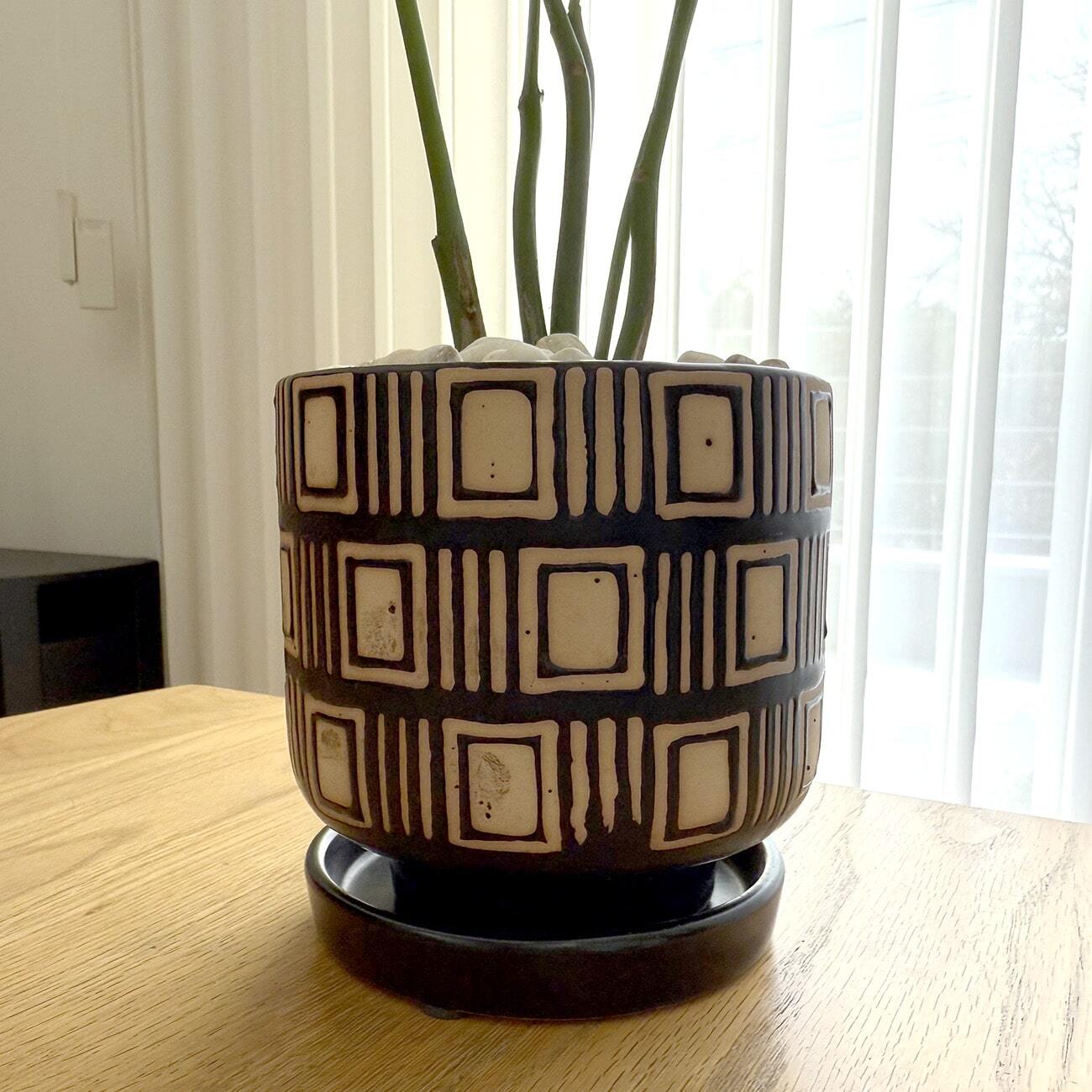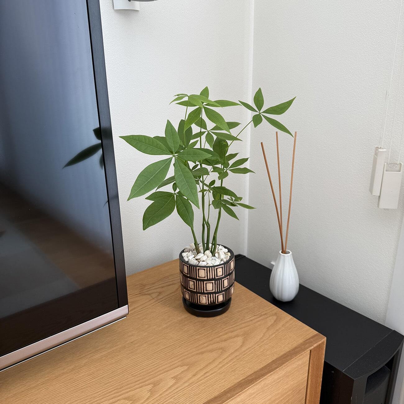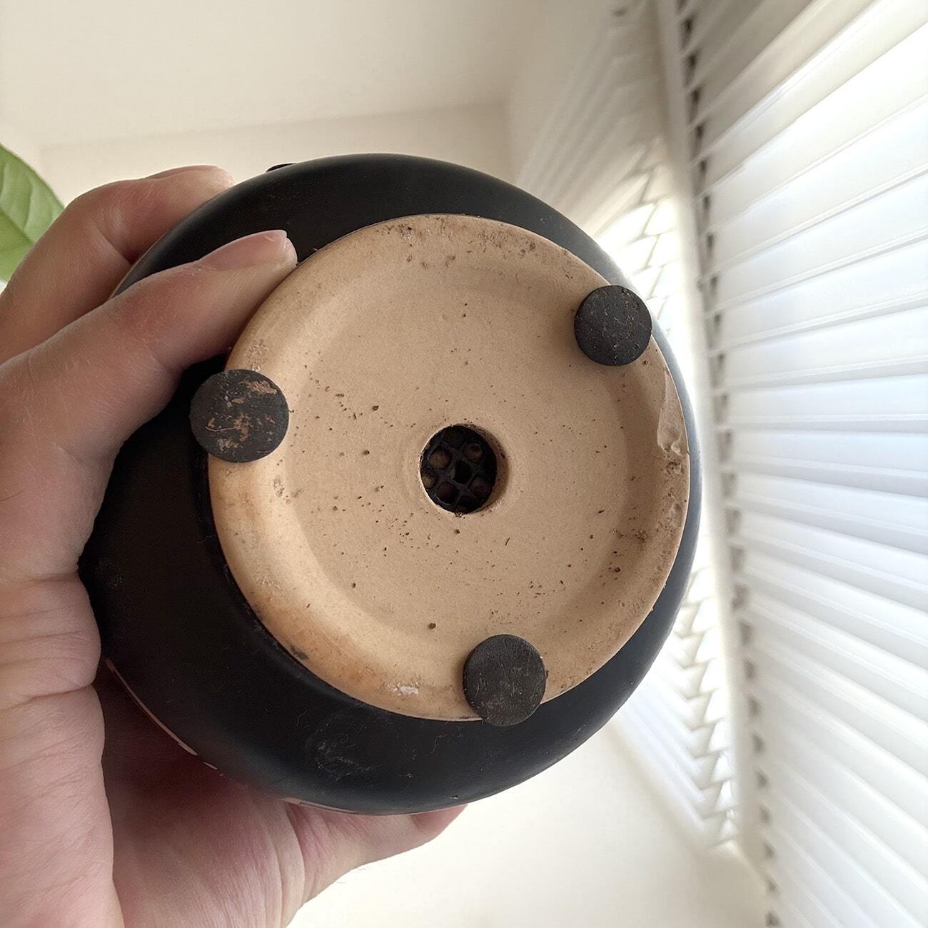 黒い陶器鉢ですが、デザインが入っているためナチュラルな空間でも置きやすい一鉢です。