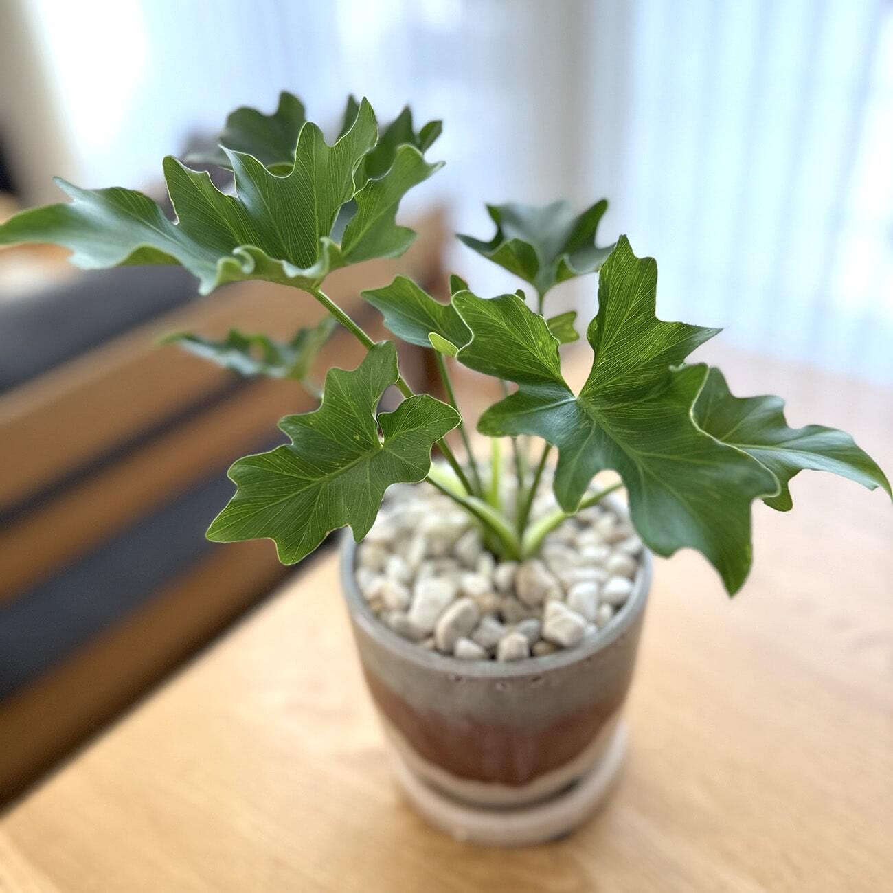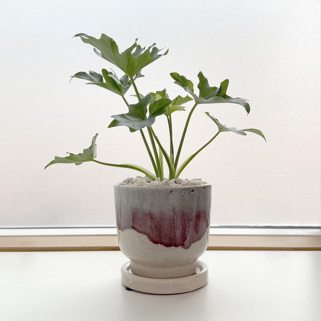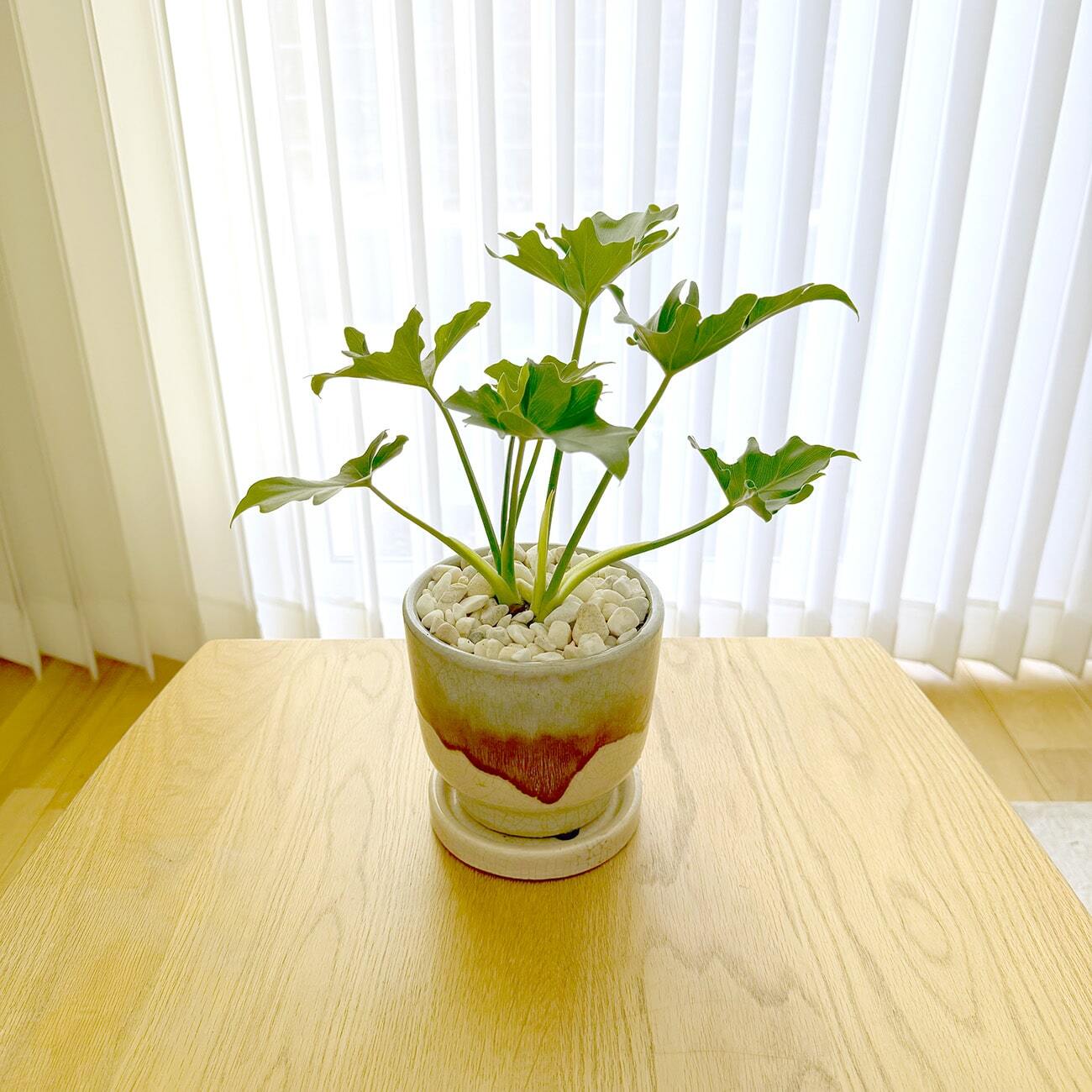 個性的な色合いの陶器鉢も目を引きインテリアグリーンとしてもしっかりと楽しめます。