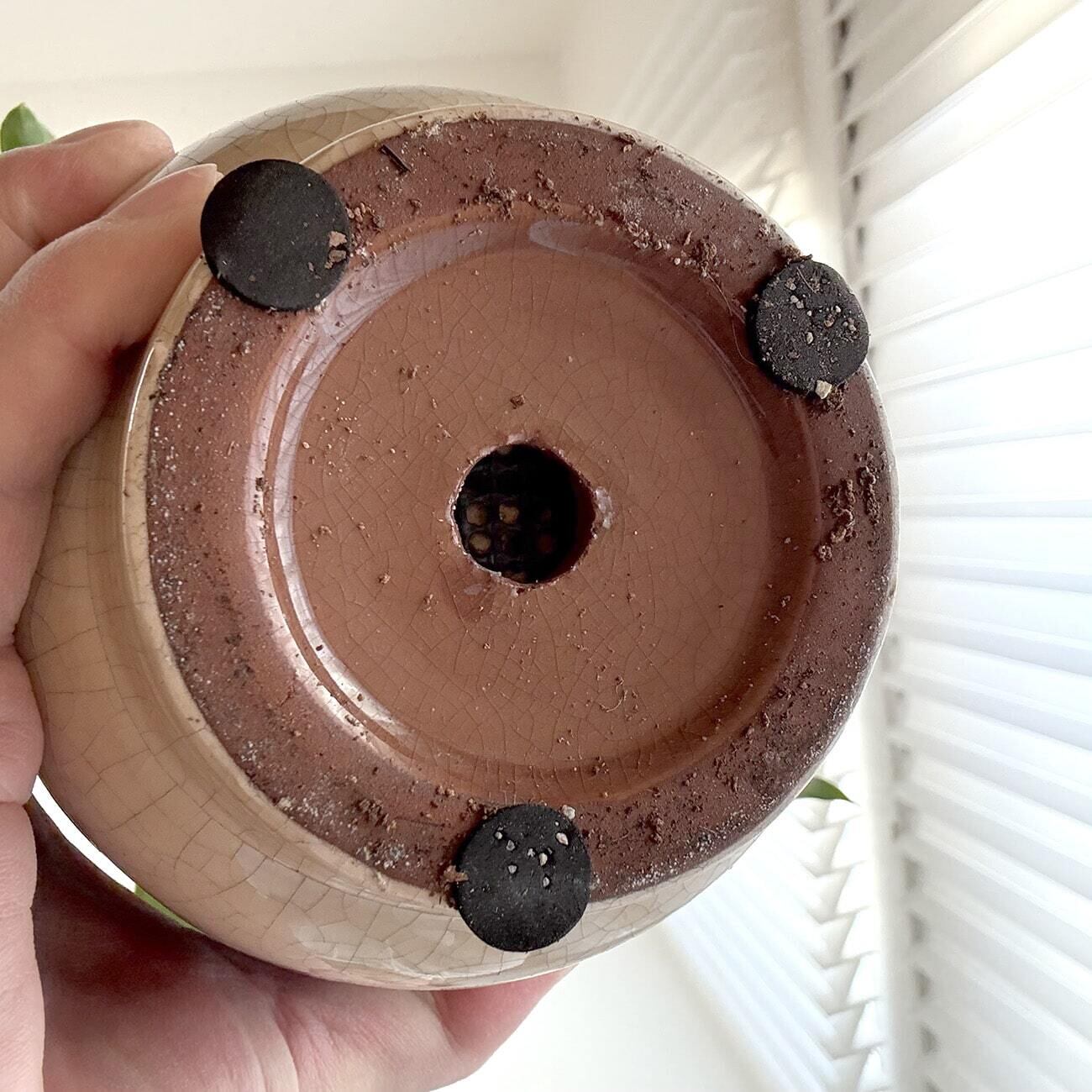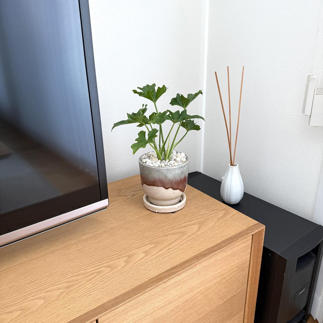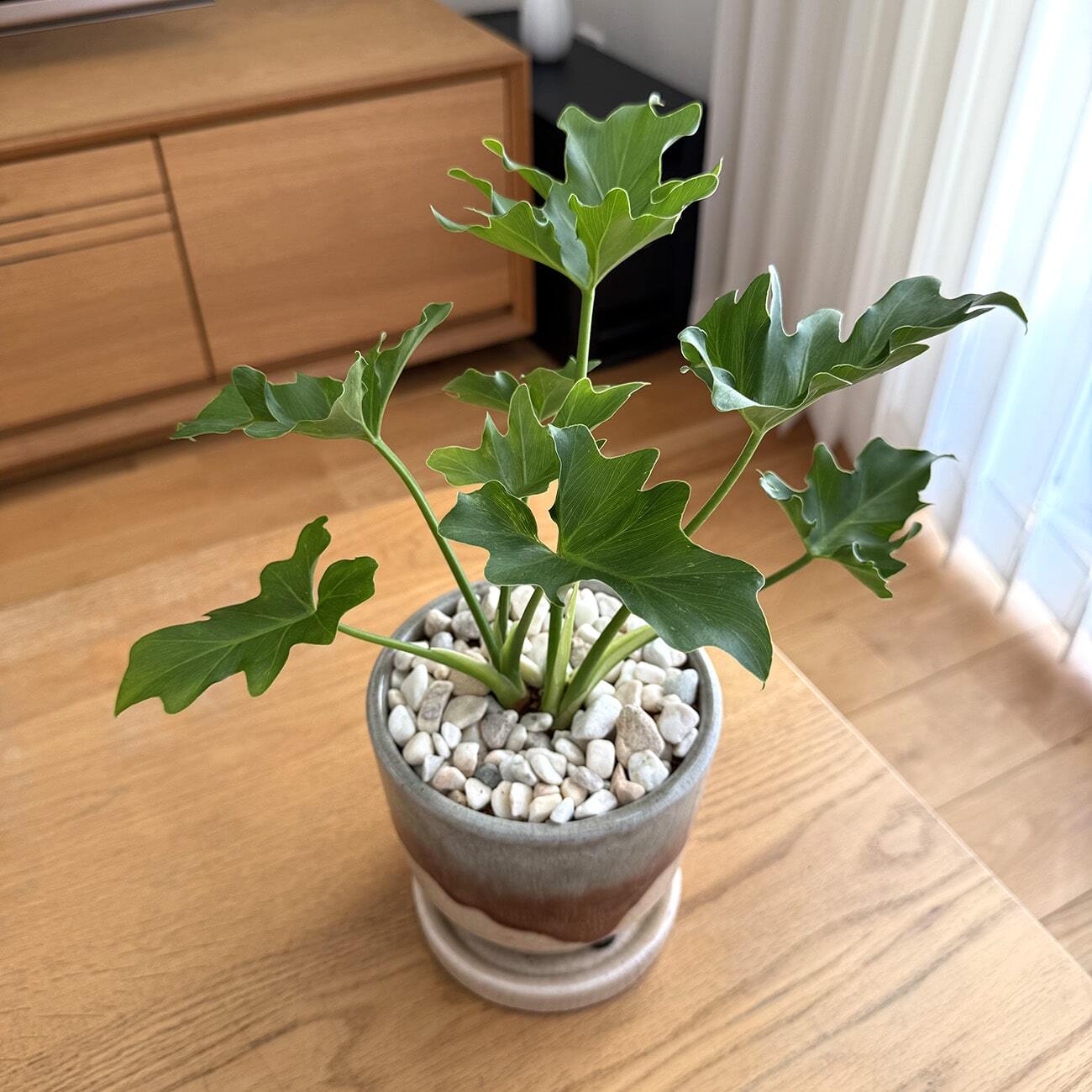 個性的な色合いの陶器鉢も目を引きインテリアグリーンとしてもしっかりと楽しめます。