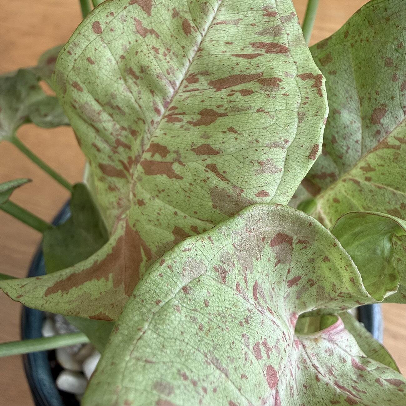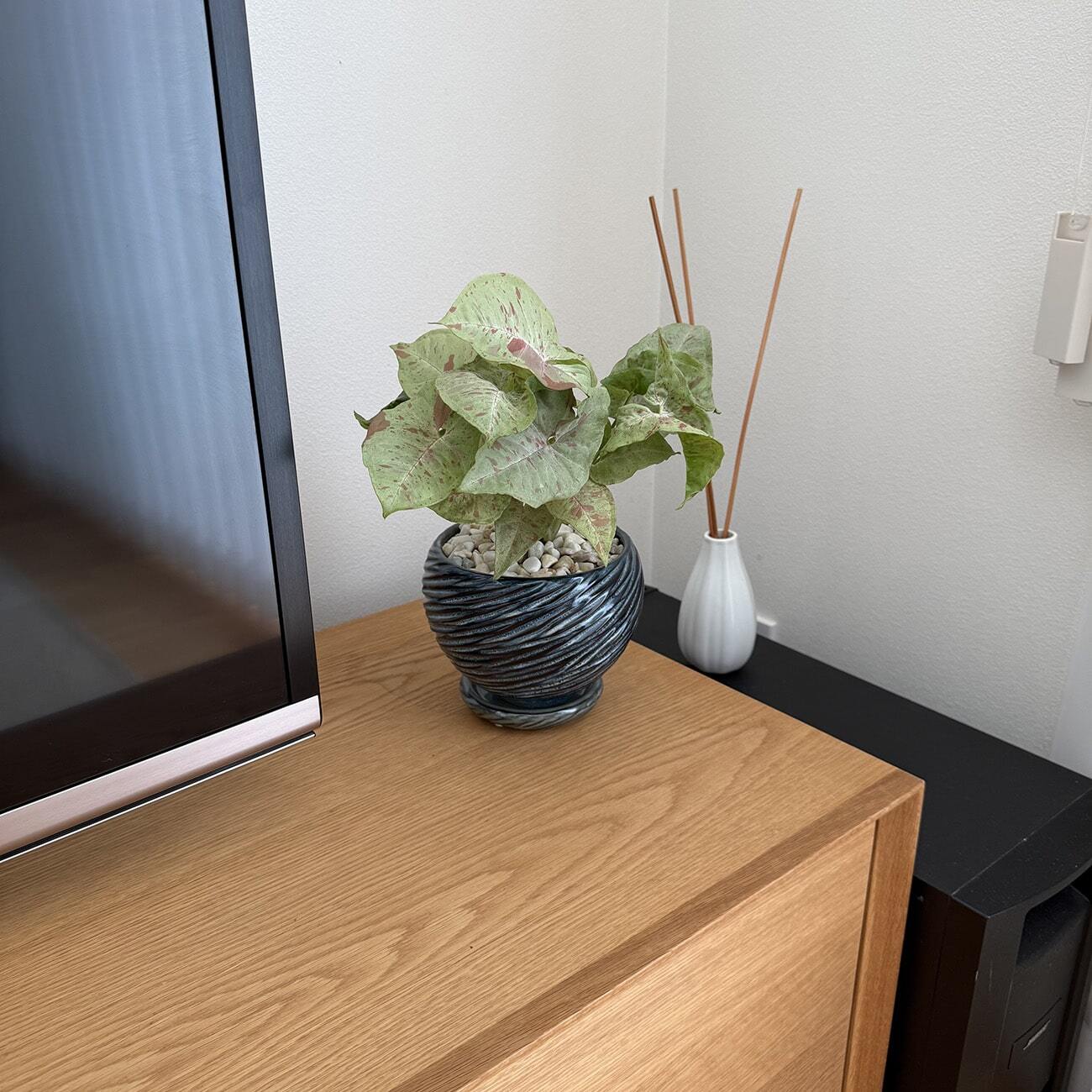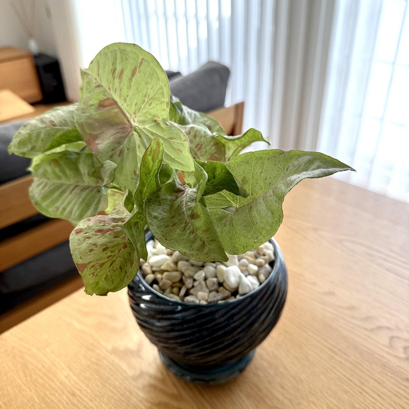 淡いグリーンの葉にピンクの散り斑が入る品種のシンゴニュウム。一枚一枚斑の入り方が異なるので、これからの成長とともにどんな葉が増えていくのか楽しみな一鉢です。乾燥にも割と強いので忙しい方でも育てやすい種類の一つです。