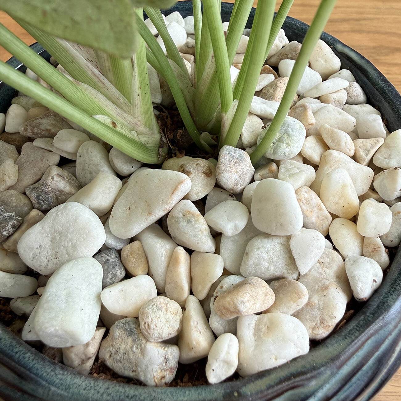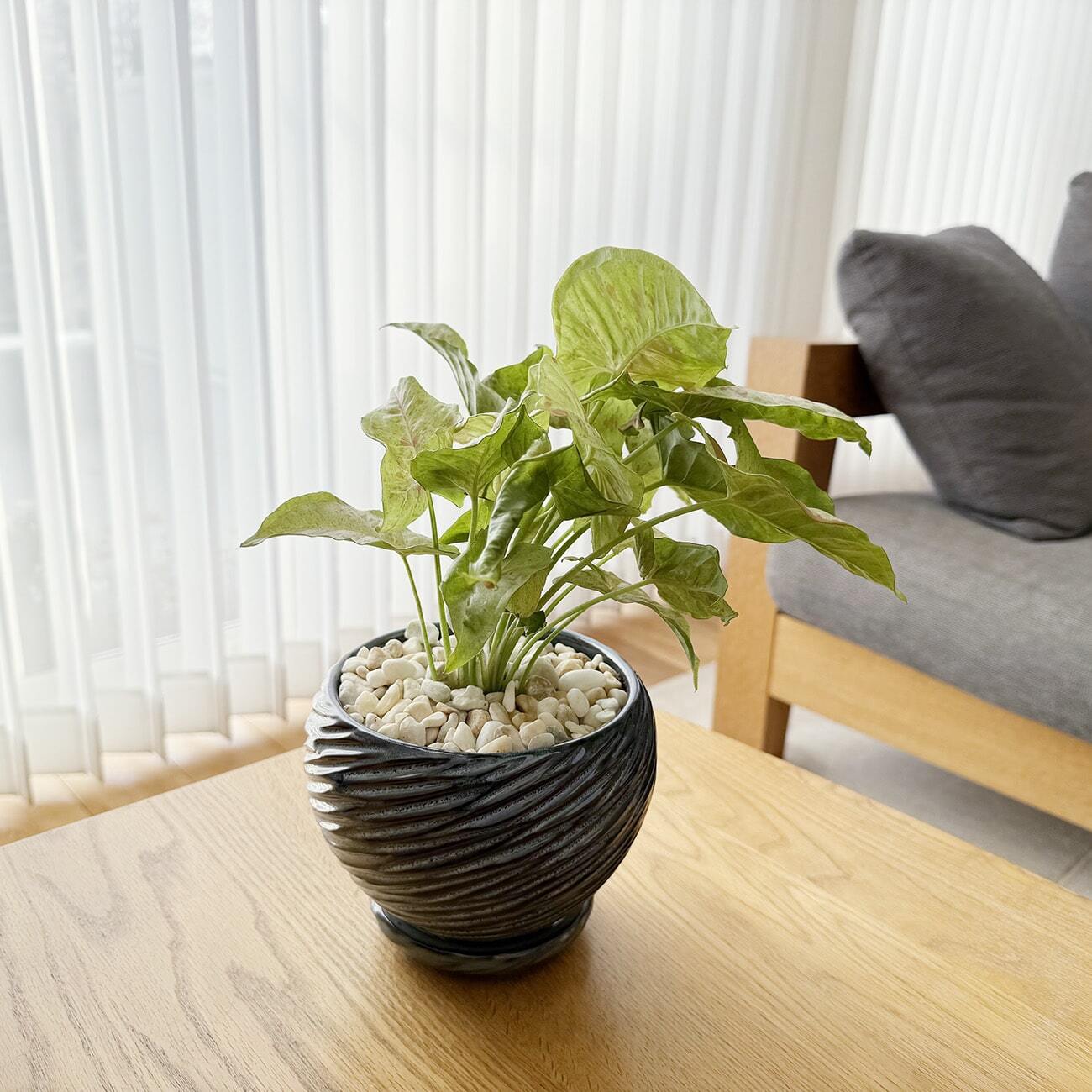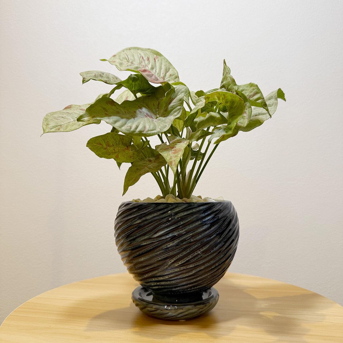 淡いグリーンの葉にピンクの散り斑が入る品種のシンゴニュウム。一枚一枚斑の入り方が異なるので、これからの成長とともにどんな葉が増えていくのか楽しみな一鉢です。乾燥にも割と強いので忙しい方でも育てやすい種類の一つです。