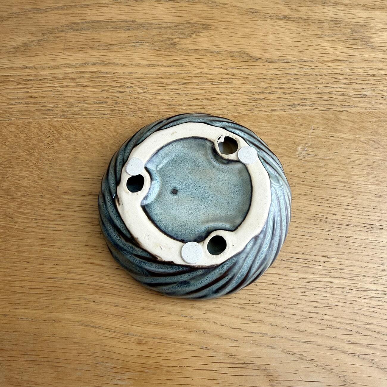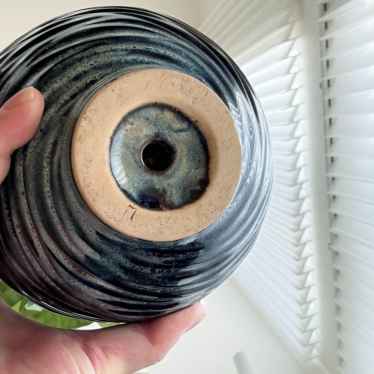 陶器鉢は艶やかなブルーに流れるようなデザインが綺麗な一鉢です。